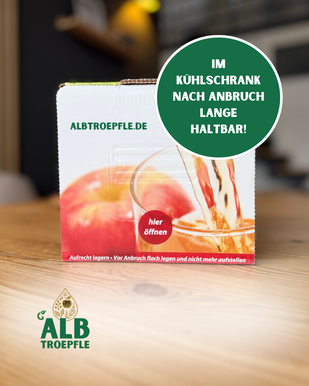 Haltbarkeit nach Anbruch: bei richtiger Lagerung im Kühlschrank und geschlossenem Zapfhahn über mehrere Wochen genießbar